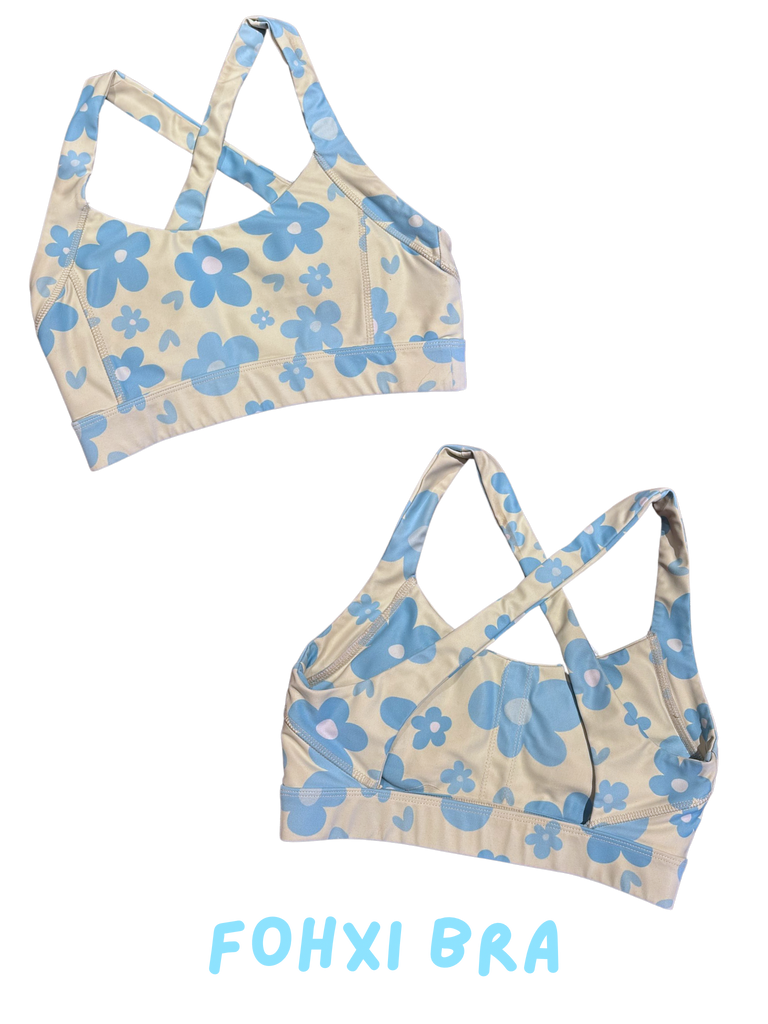 Featuring a delicate criss-cross back detail, this bra offers light-to-medium support, keeping you secure whether you're hitting the gym or lounging by the beach. The print—a playful blend of retro floral designs in cool oceanic blues—brings a fresh, fun energy to your workout wardrobe. This beauty is well suited to bigger busts or smaller busts.
